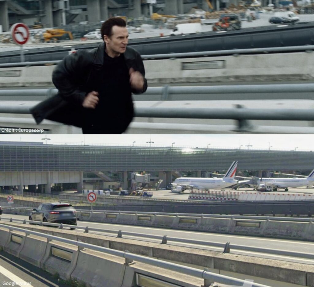 La scène du film Taken se déroule à l’Aéroport de Paris-Charles-de-Gaulle, le principal aéroport international de la capitale. Inauguré en 1974 et souvent appelé simplement Roissy, il fait partie des plus grands hubs aéroportuaires d’Europe. À l’écran, on reconnaît facilement le lieu grâce à plusieurs éléments caractéristiques : la tour de contrôle, les larges voies rapides qui entourent les terminaux et surtout les routes et échangeurs surélevés qui traversent le complexe.