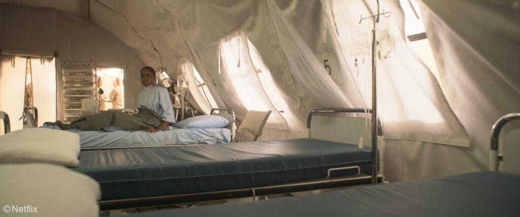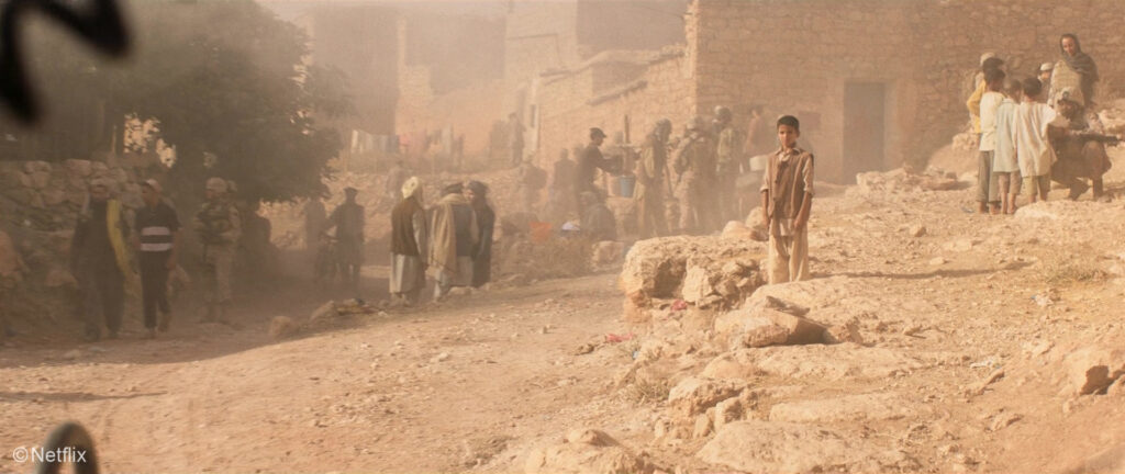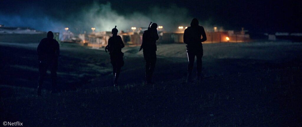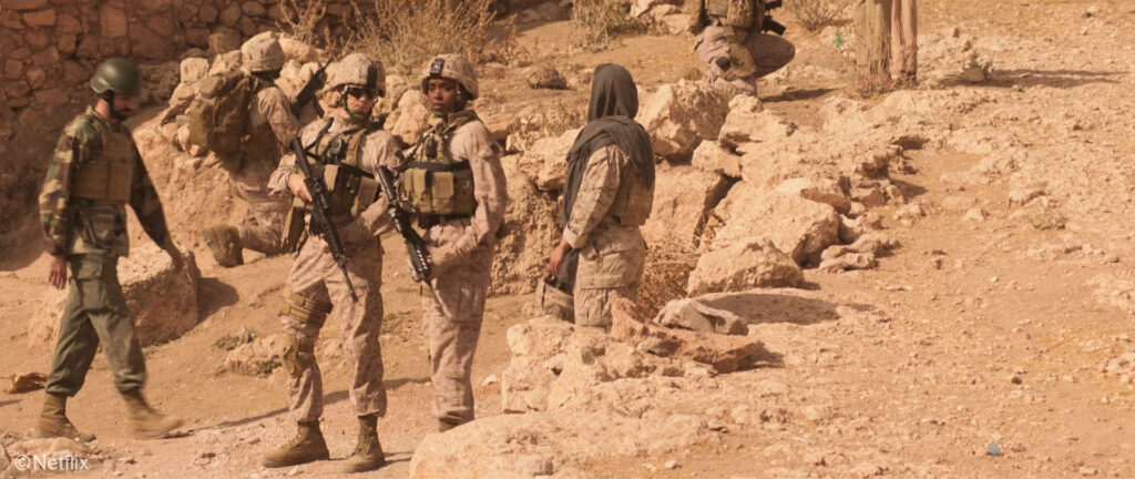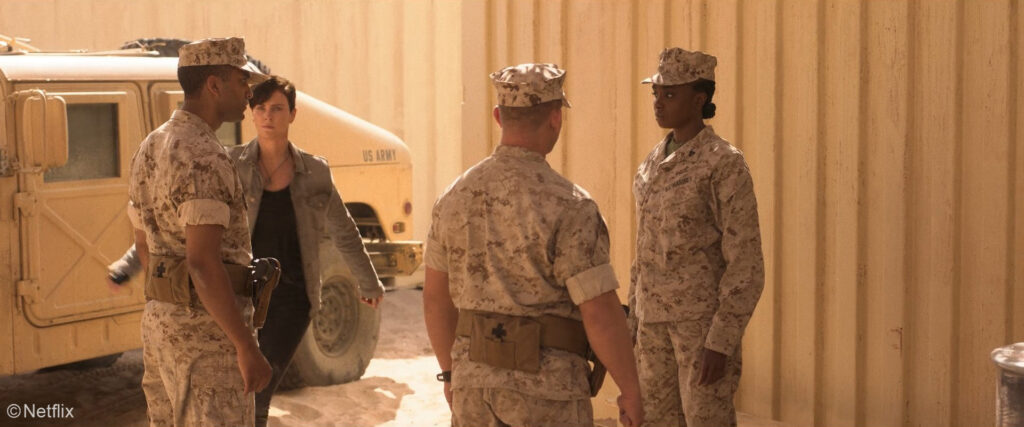 Alors qu’ils s’apprêtent à capturer leur cible, l’opération tourne mal, et Nile se fait mortellement égorger, enfin, mortellement… presque. C’est dans cette scène qu’on découvre Nile Freeman (incarnée par Kiki Layne), une jeune marines en mission avec son unité dans un village supposément afghan.