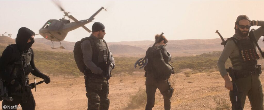 Andy, Joe, Nicky et Booker sont déposés par hélico dans ce qui est censé être le Soudan, pour une mission de sauvetage. Le terrain désertique, les couleurs ocres et les reliefs font penser au désert d’Agafay, à une trentaine de minutes de Marrakech. C’est un spot souvent utilisé pour simuler des décors africains ou moyen-orientaux.