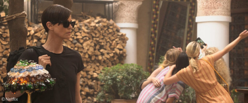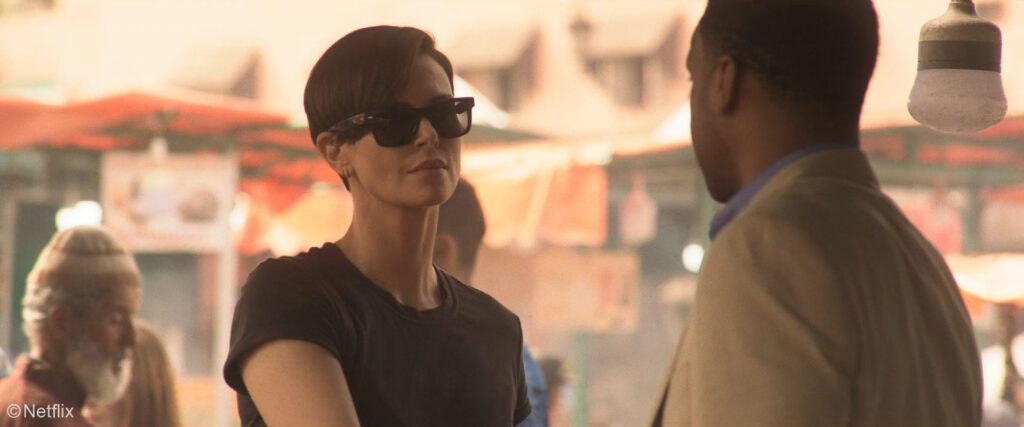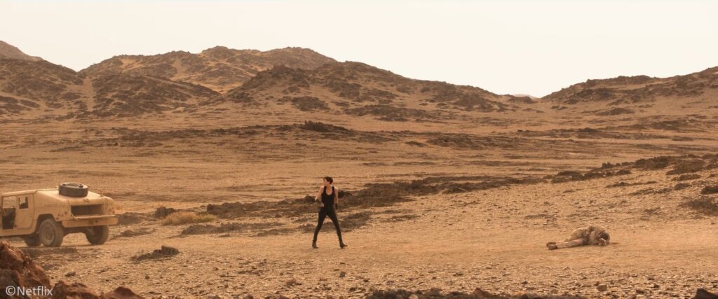 Andy enlève Nile et l’allonge inconsciente à l’arrière d’un véhicule militaire de type AM General HMMWV M1025. Nile finit par se réveiller, saute du Hummer en marche, puis Andy s’arrête, lui tire dessus pour éviter qu’elle s’échappe et lui prouver son immortalité. Ce moment fort a sans doute été tourné dans le désert d’Agafay ou aux abords de Kettara.