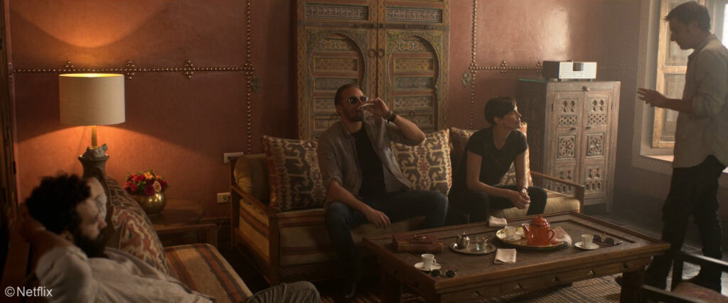 Juste après, changement d’ambiance avec l’extra large room rosée et sa cheminée design, que l’on peut admirer sur le site d’El Fenn. C’est dans cette chambre que Yusuf al-Kaysani, alias Joe (Marwan Kenzari), et Nicolò di Genova alias Nicky (Luca Marinelli) retrouvent Andy et Booker pour un point tactique entre immortels. La pièce est reconnaissable entre mille grâce à son camaïeu de tons chauds, ses arches traditionnelles et sa vibe ultra cosy. Et pour les curieux : oui, cette suite est réservable… mais budget immortel requis.