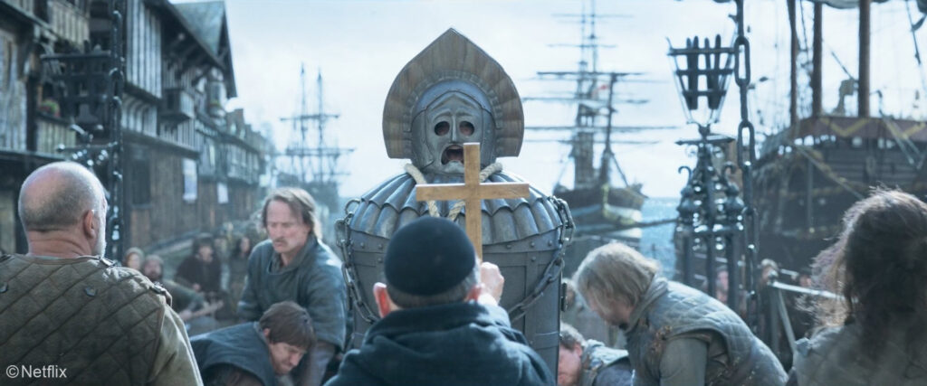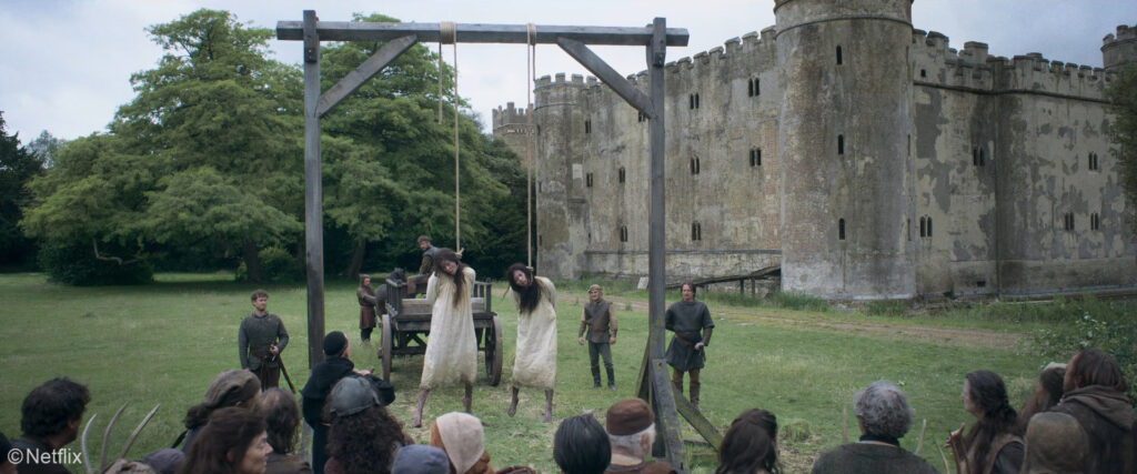 Ce flashback a été tourné à l’extérieur de Shirburn Castle, dans l’Oxfordshire, à proximité de l’église All Saints. Pour renforcer la crédibilité historique de la scène, le château a été retouché en post-production afin de supprimer les modifications architecturales post-médiévales.