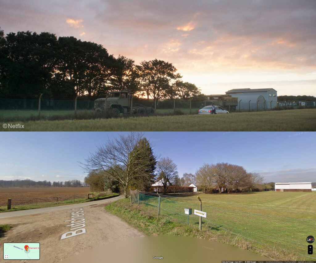 White Waltham est un aérodrome privé, réputé comme l’un des plus anciens du Royaume-Uni. Situé dans la campagne du Berkshire, il s’étend sur 80 hectares de terrain et est considéré comme le plus grand aérodrome avec de l’herbe en Grande-Bretagne. Un cadre étonnant pour un décor de guerre, mais parfaitement transformé pour les besoins du film.