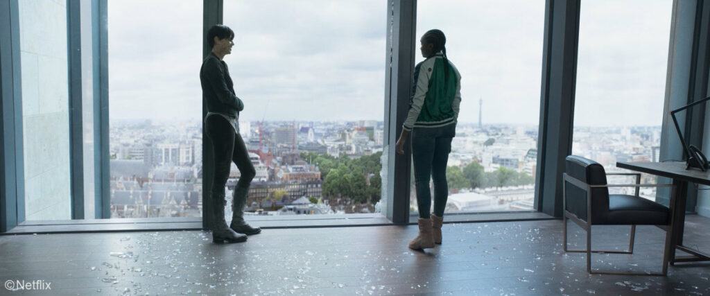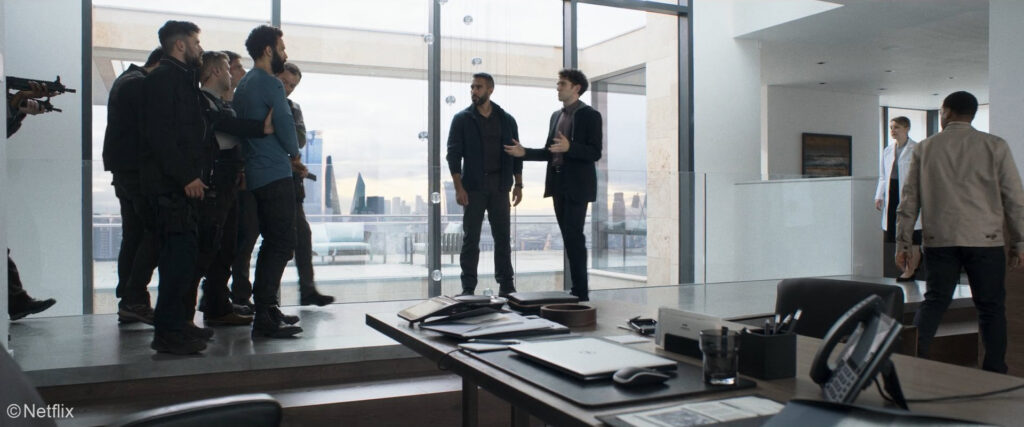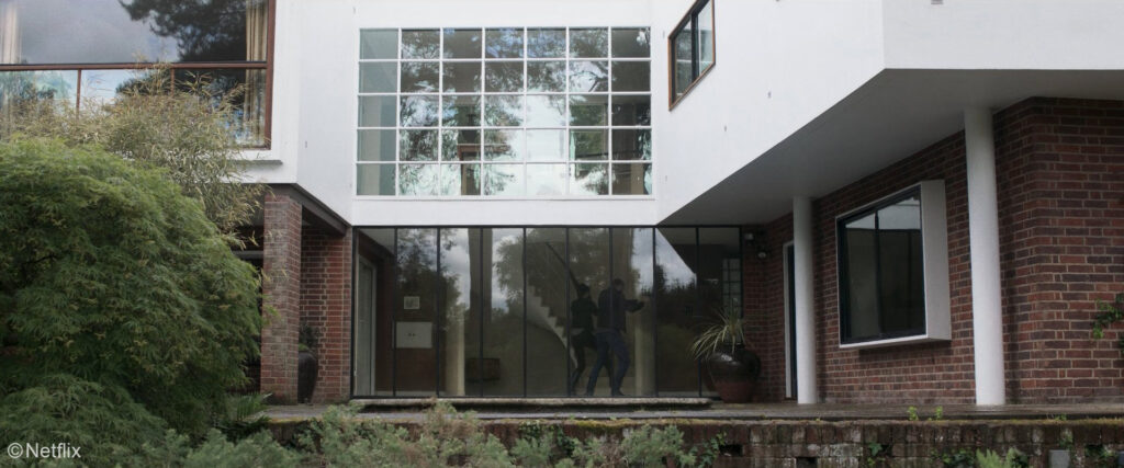 Conçue par Lewandowski Architects en 2016, la maison mélange architecture contemporaine et cadre naturel traditionnel. Avec ses grandes baies vitrées du sol au plafond et ses volumes ouverts, elle a permis à l’équipe de donner l’illusion d’un penthouse londonien malgré son environnement campagnard. Comme le raconte Sara Bennett dans son interview pour Art of VFx : l’équipe a dû transformer la maison en penthouse londonien, en gérant les reflets et en utilisant des prises de vue 360° pour reproduire différents moments de la journée. L’intérieur s’organise sur plusieurs niveaux avec deux ailes reliées par un passage central, parfait pour tourner des scènes d’action fluides. La production y est restée deux semaines pour filmer toutes les scènes intérieures.