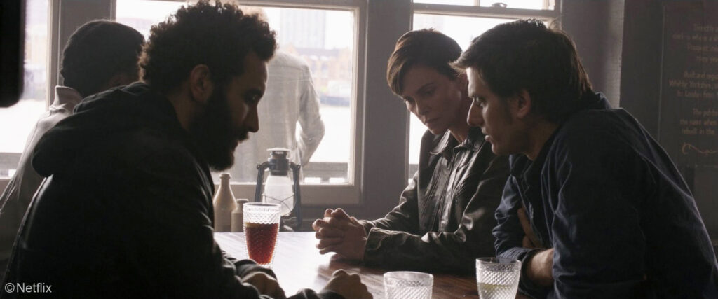 Andy, Nicky, Joe et Nile se retrouvent dans un pub pour décider du sort de Booker après sa trahison. L’atmosphère est lourde, les mots sont pesés. Un peu plus tard, Nile et Booker échangent à l’écart sur le balcon, parlant de ce qui attend Nile et de sa place au sein de l’équipe.